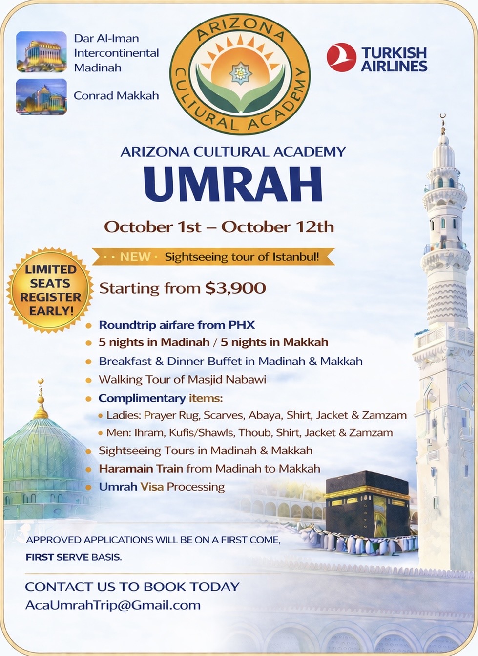 Join us as we embark together on the most spiritual journey to the most blessed lands of Madinah and Makkah, visiting our blessed Prophet (PBUH), completing the rites of Umrah, purifying our souls of accumulated sins and nourishing our hearts with a strengthened faith.